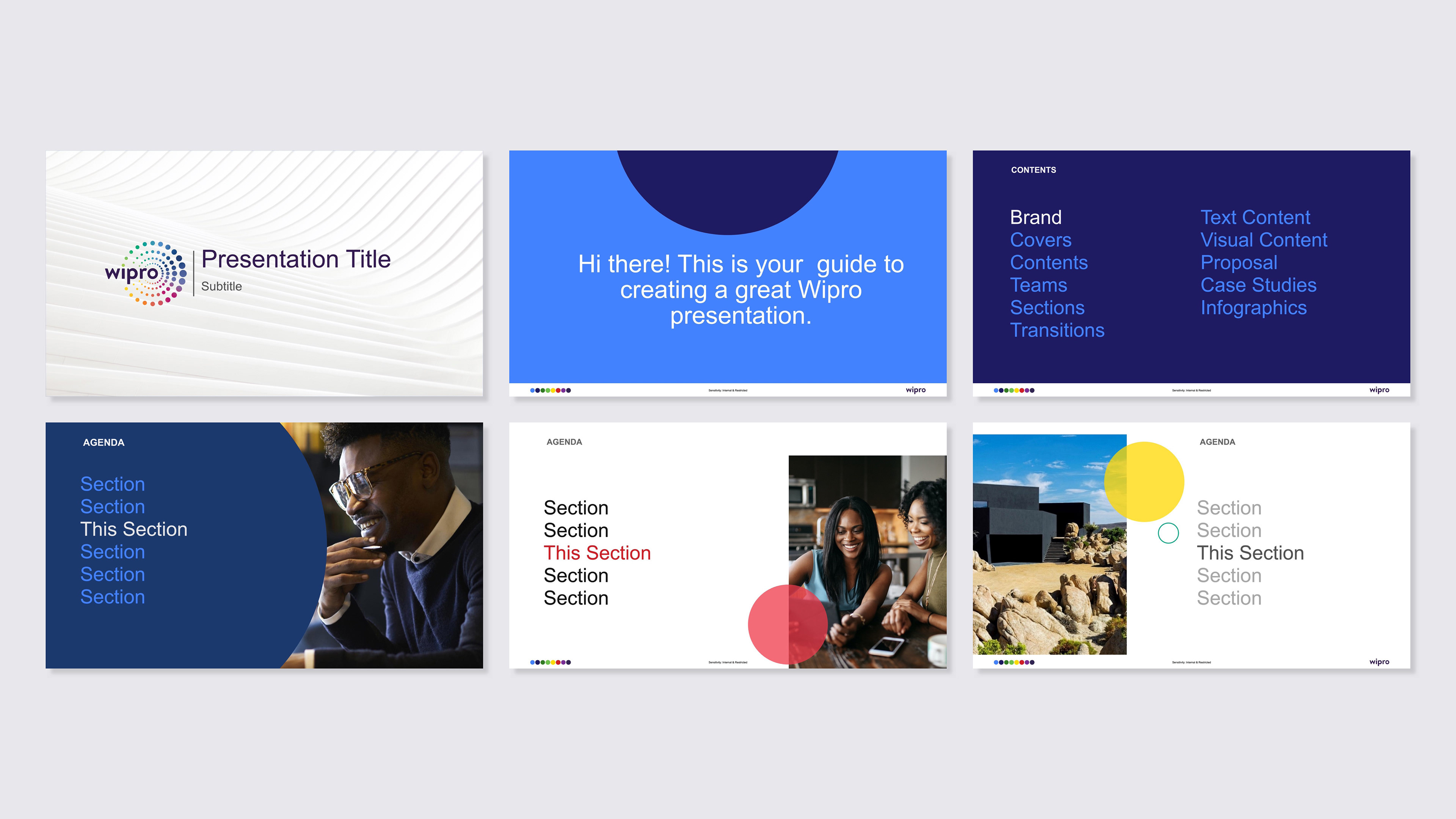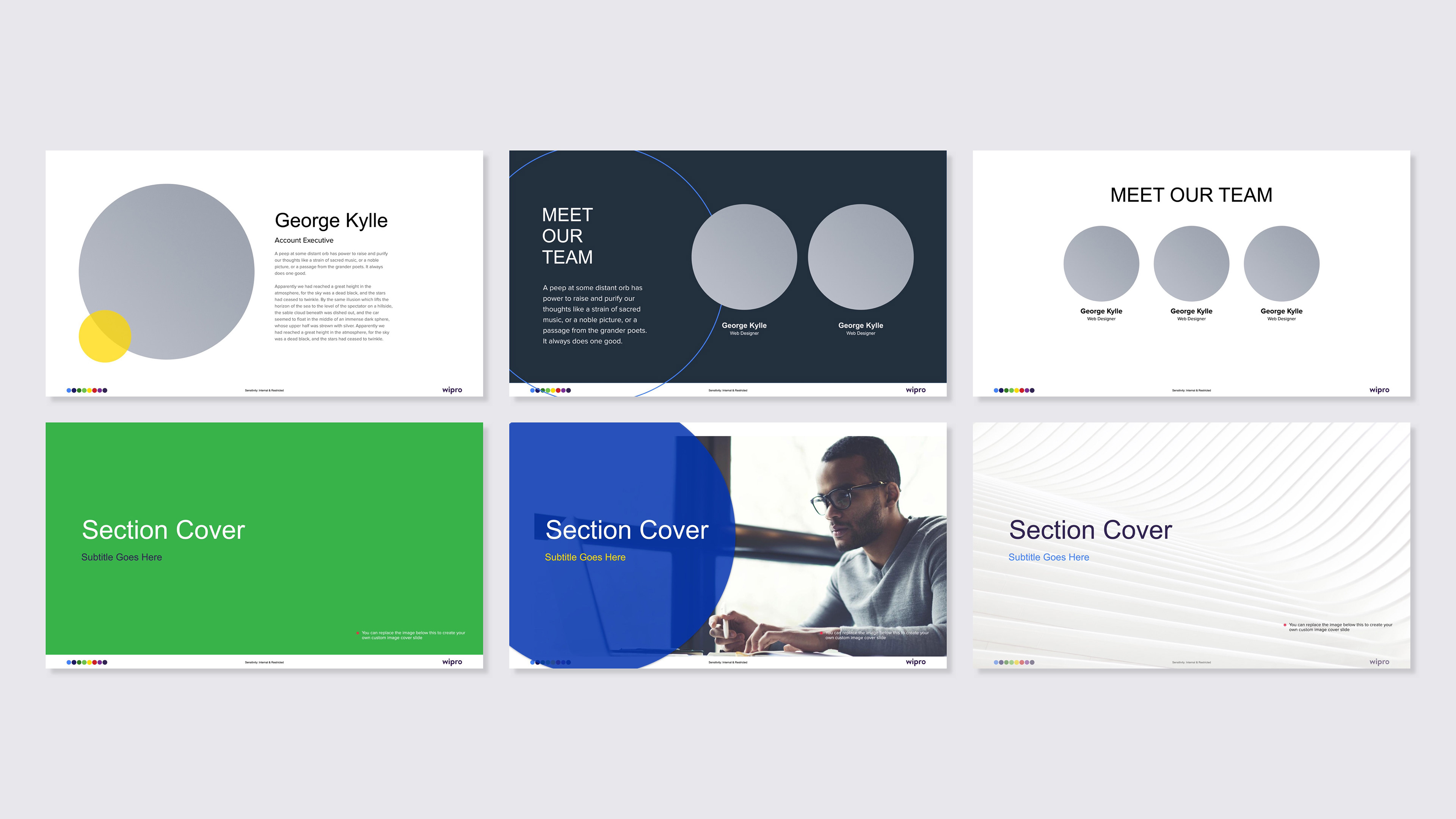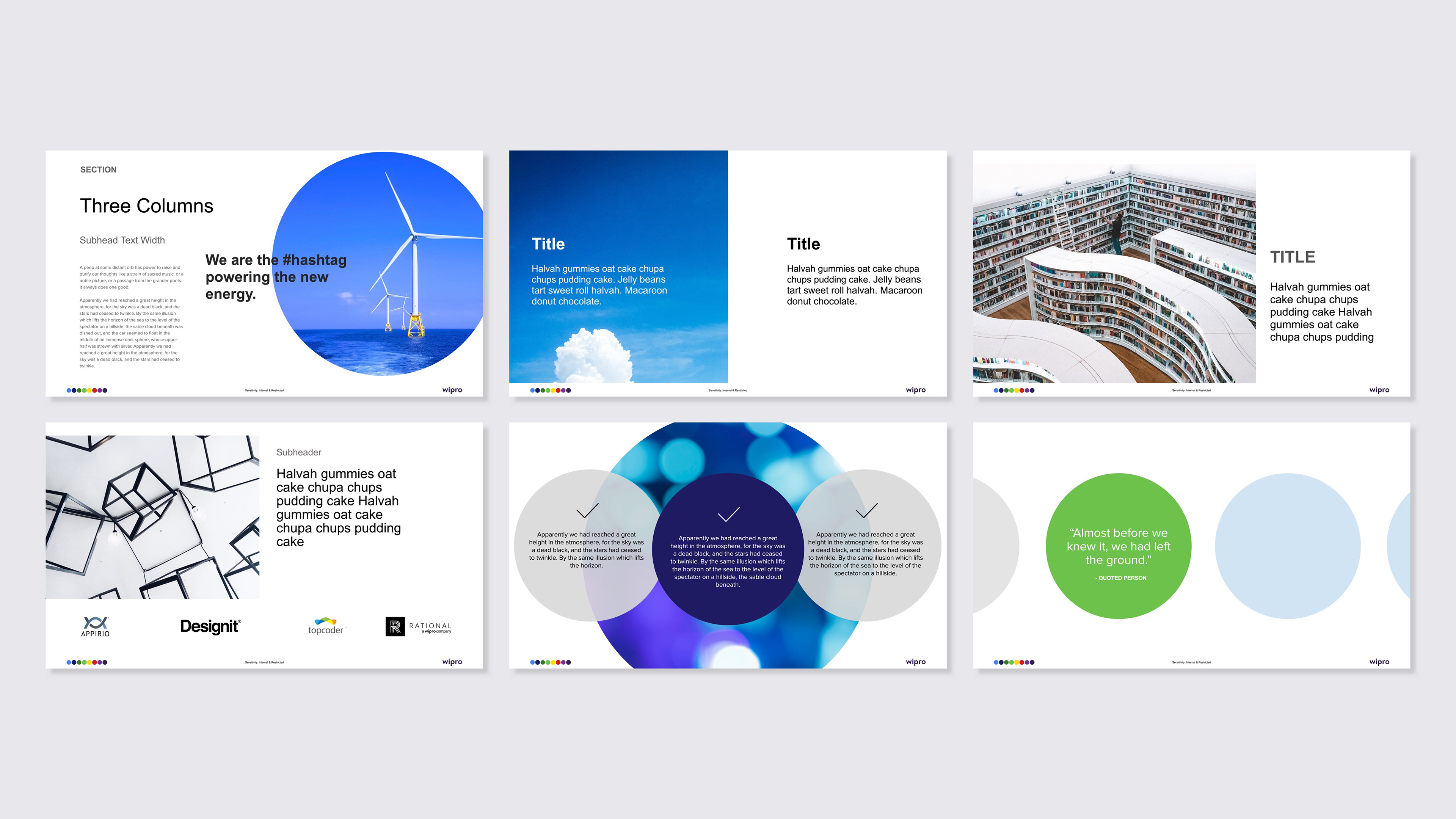 When we came on board Wipro had 182,886 employees, and just as many versions of their presentations. We redefined their presentation experience, prioritizing simplicity by encouraging less text in the presentations and more visual elementsfeaturing the trademark Wipro circles to create an eye catching template that was easy to use.