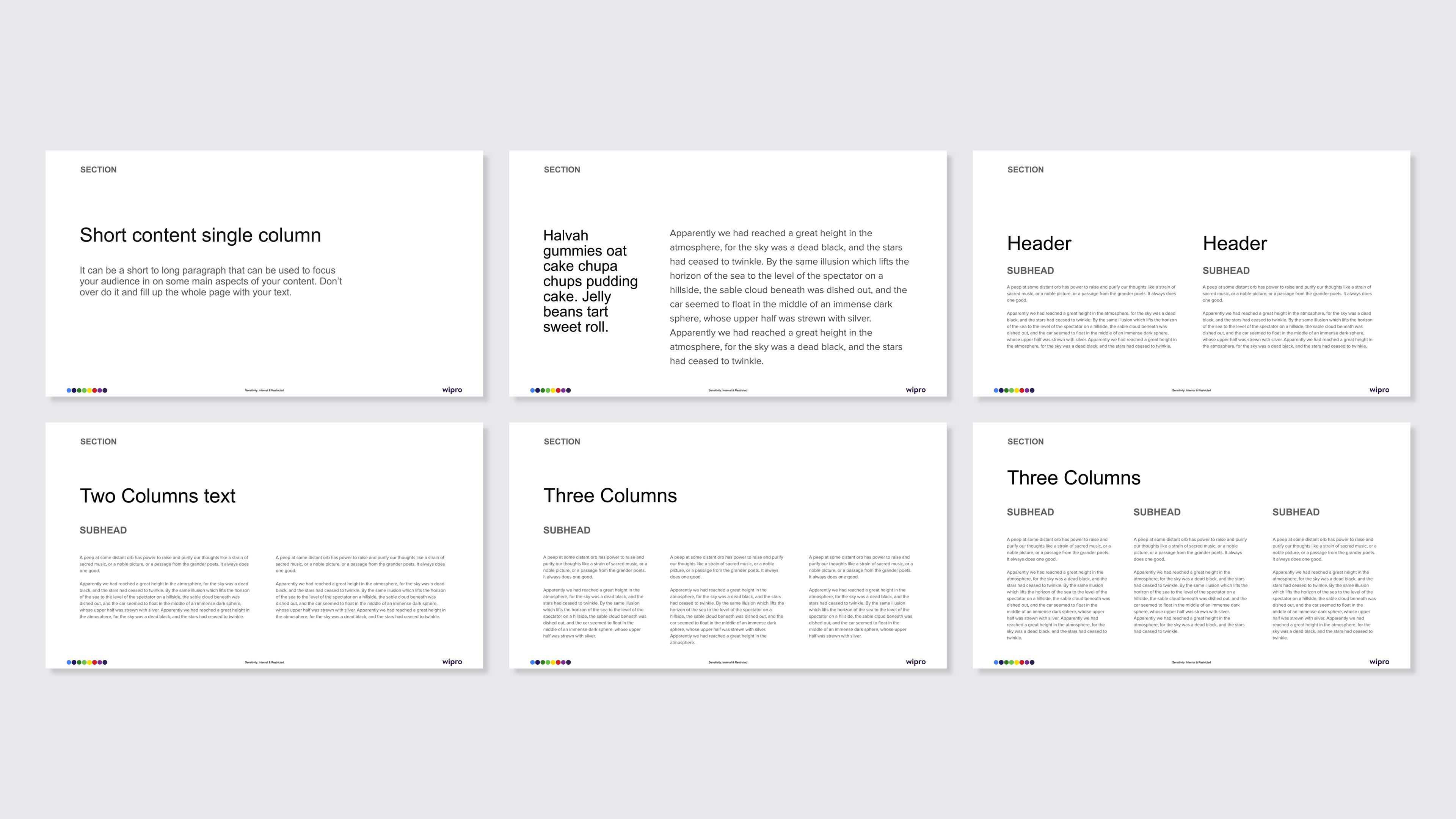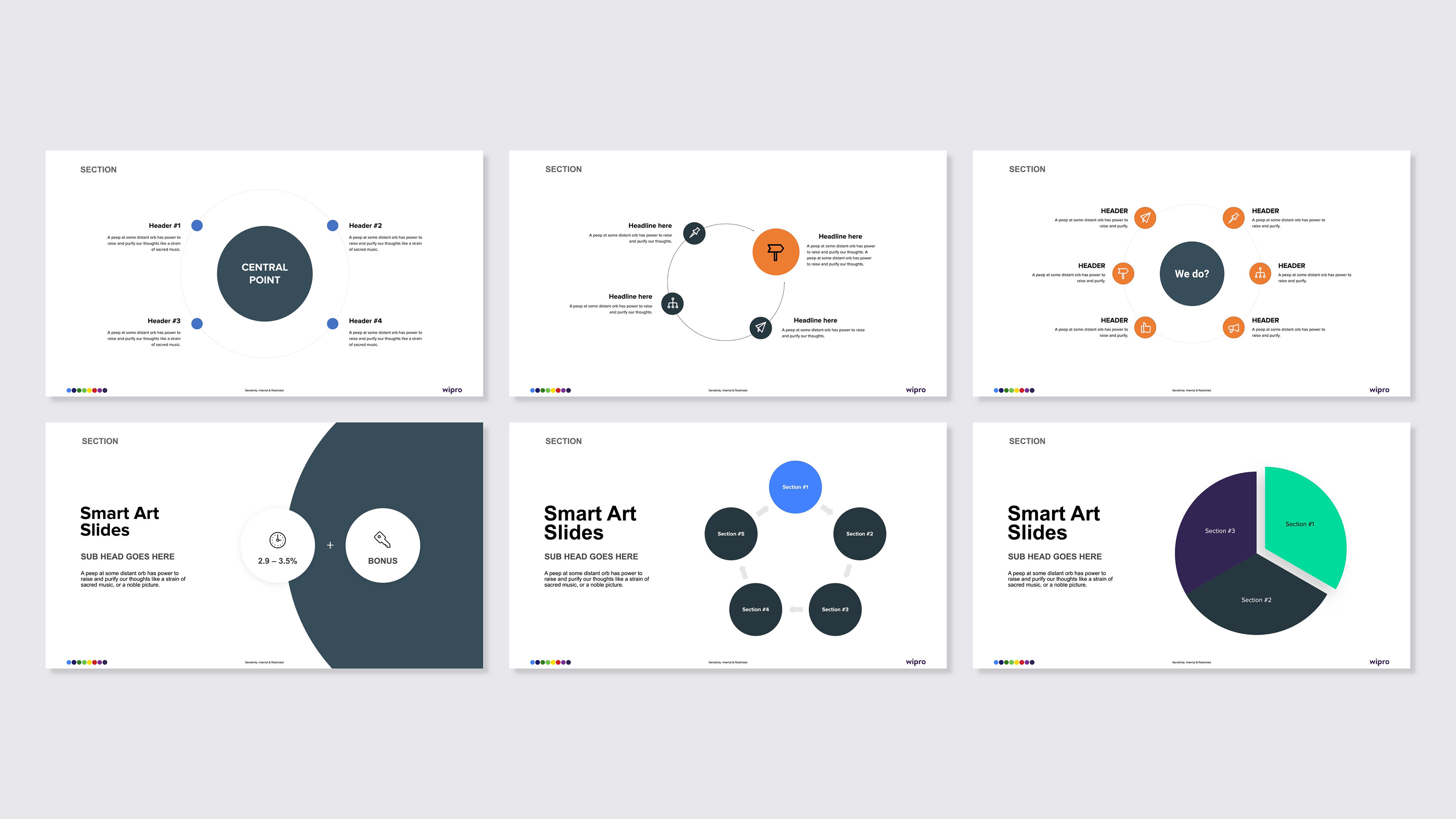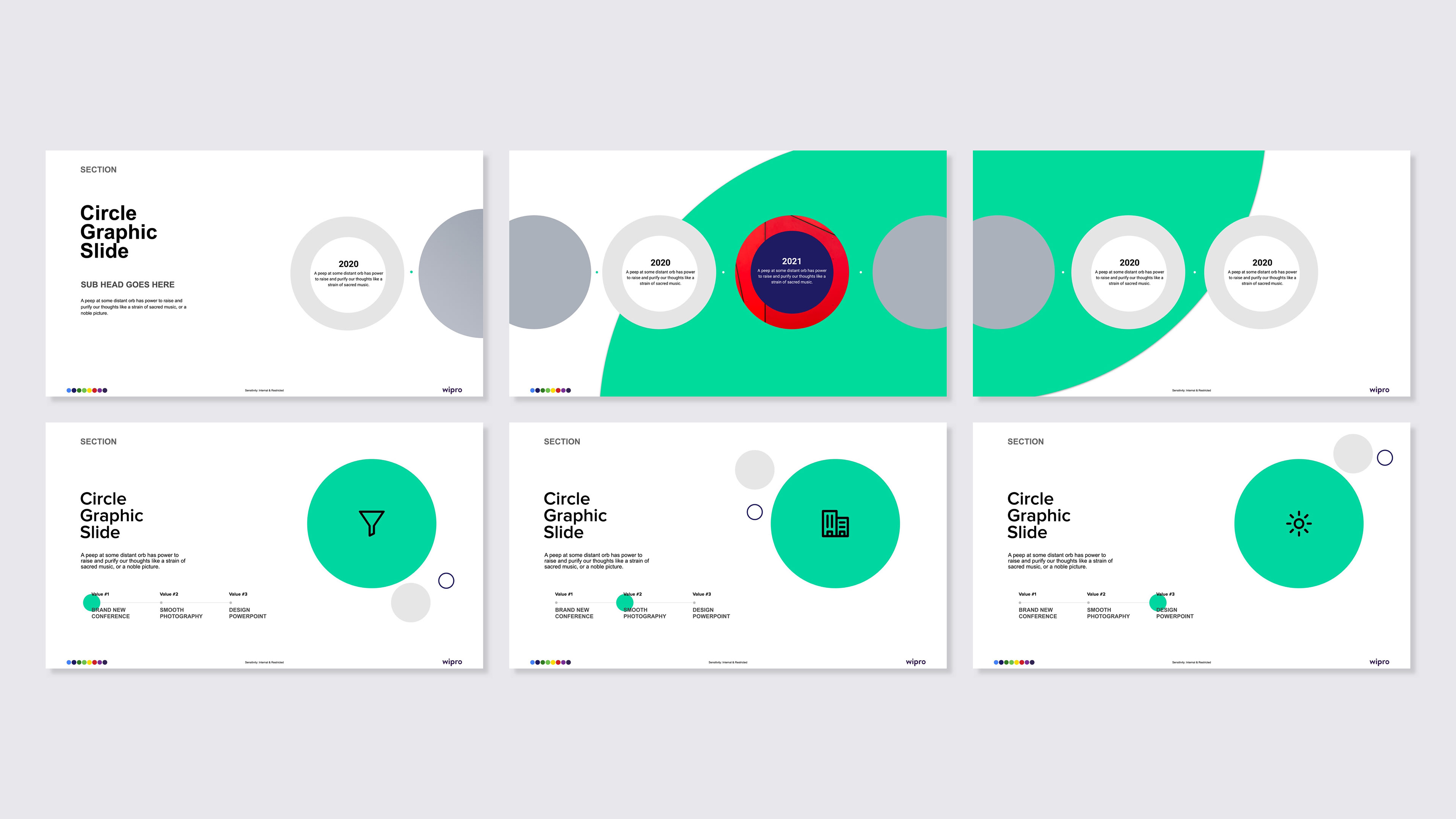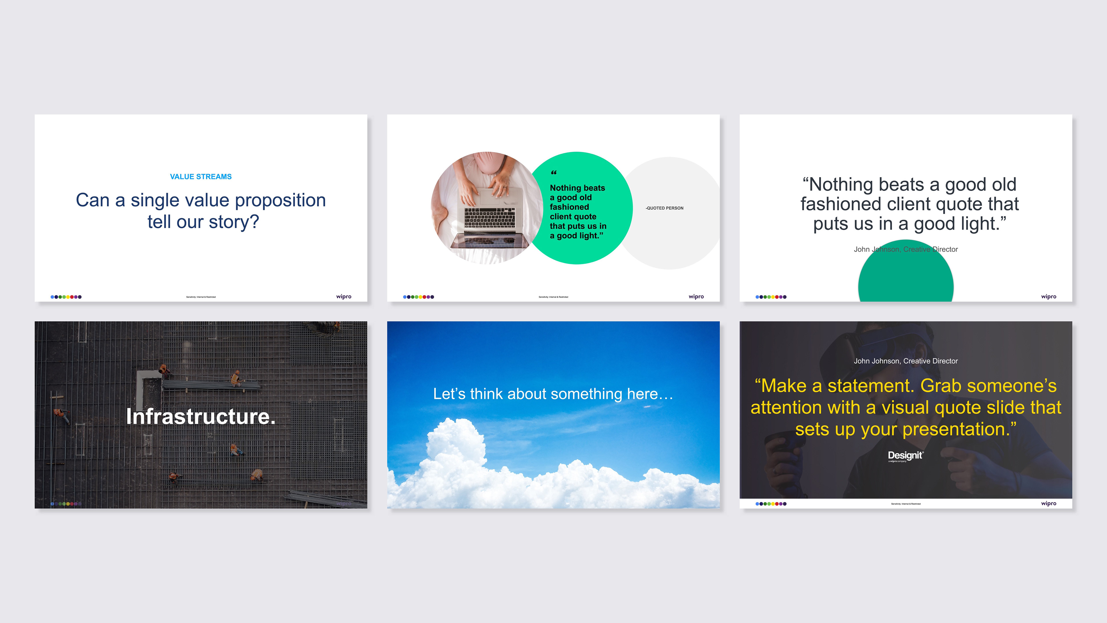 When we came on board Wipro had 182,886 employees, and just as many versions of their presentations. We redefined their presentation experience, prioritizing simplicity by encouraging less text in the presentations and more visual elementsfeaturing the trademark Wipro circles to create an eye catching template that was easy to use.